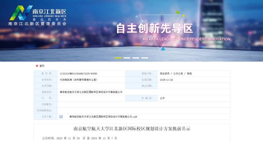 11月28日配资炒股门户网站,南京江北新区管理委员会发布南京航空航天大学江北新区国际校区规划设计方案批前公示。公示时间为2025年11月28日至2025年12月7日。