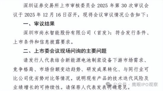 12月16日晚间,深交所公告显示,上市审核委员会2025年第30次审议会议当日召开,深圳市尚水智能股份有限公司(以下简称“尚水智能”)首发过会。